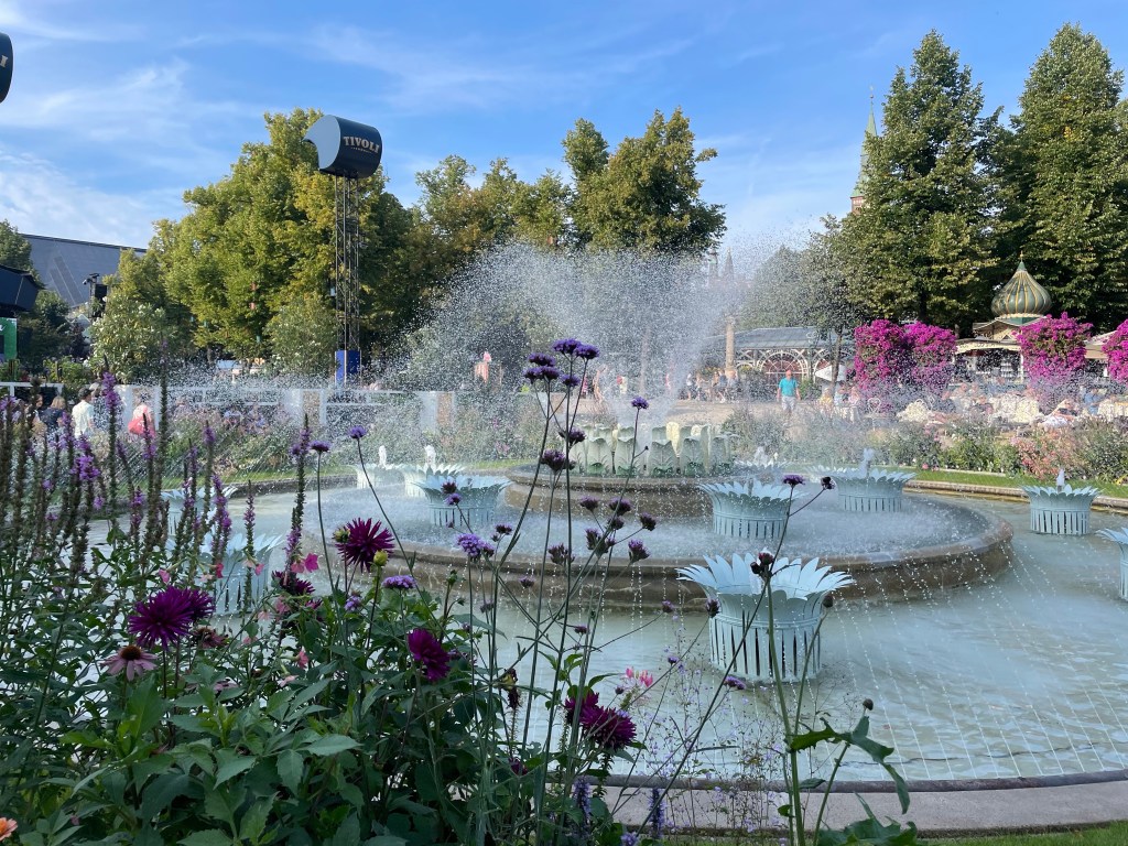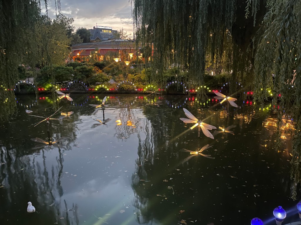 After dark, the park became something truly magical as the lights glittered on. I don’t think I’ve ever seen anything quite like it. The Japanese Pagoda was illuminated in tiers of red lights, and beside it swooped the loop of the Demon rollercoaster. https://www.tivoli.dk/en/rides/the-demon All the thousands of lights were reflected in the black water of Tivoli’s lake, and in the trees there were strung large, geometric sculptures of dichrotic glass, gleaming with golden light. One of my personal favorite spots in the park was a garden that was a formal, geometric grid of bubbling, illuminated fountains, interspersed with beautiful drifts of flowers- clouds of snowy white poppies or anemones. There were glowing, animatronic dragonflies slowly fluttering their wings just above the water’s surface, and big banks of full-blown roses ringing the Swing Carousel. https://www.tivoli.dk/en/rides/the-swing-carousel It truly was breathtakingly beautiful!